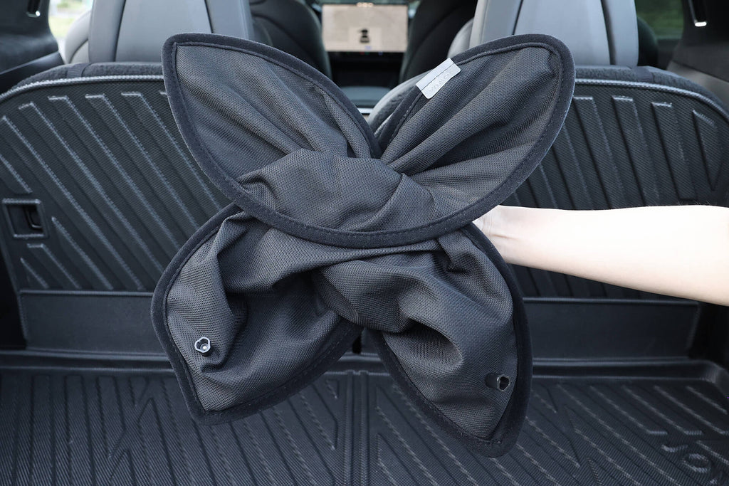 - 將遮陽簾收納在內附收納袋中,並可搭配Jowua 行李廂墊,將收納袋放置在後行李廂的下層儲物區。