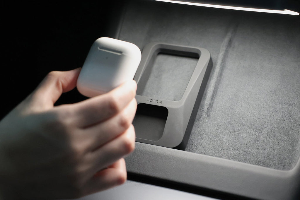 AirPods不再無處安放!底座完美擺放於特斯拉車內無線充電盤,並與精準對位線圈。同時滿足精巧收納與無線充電。
