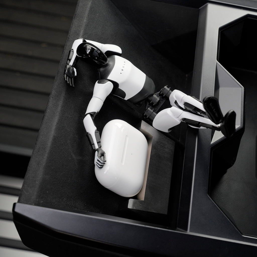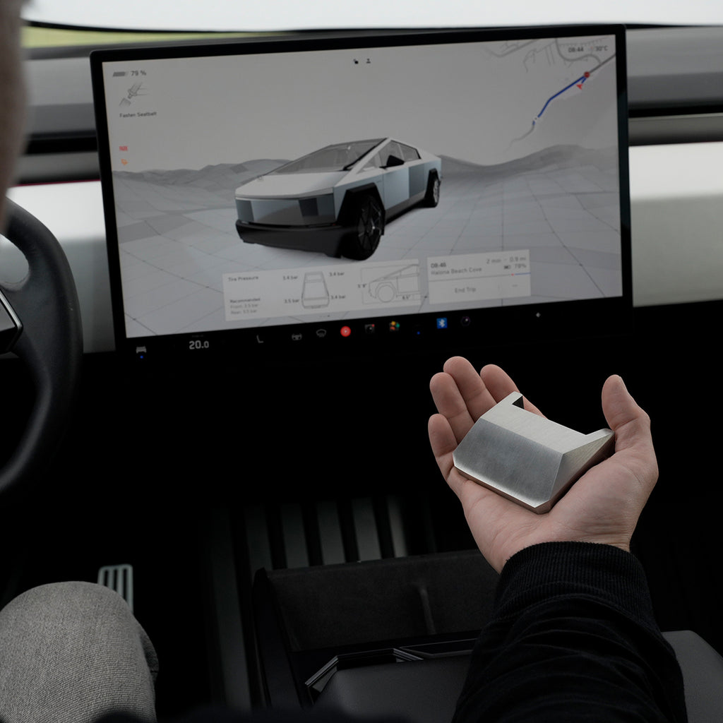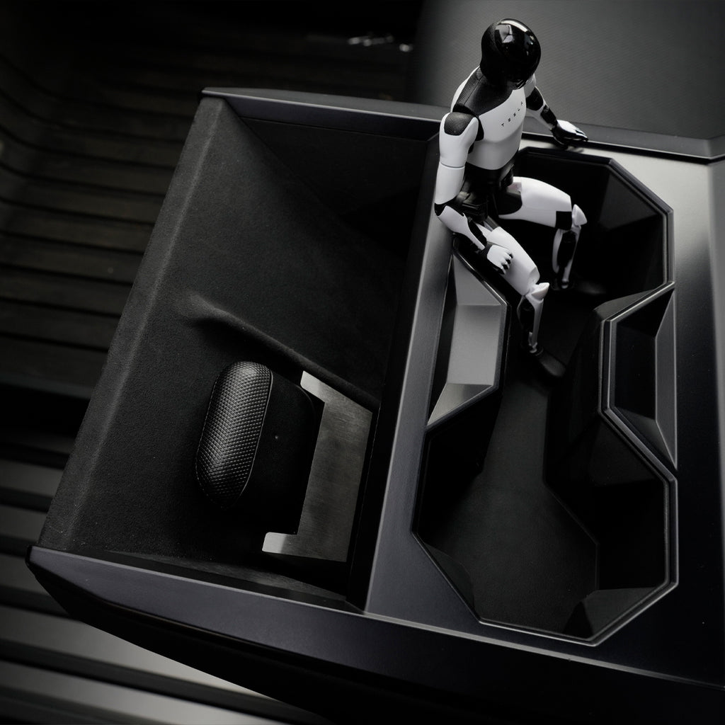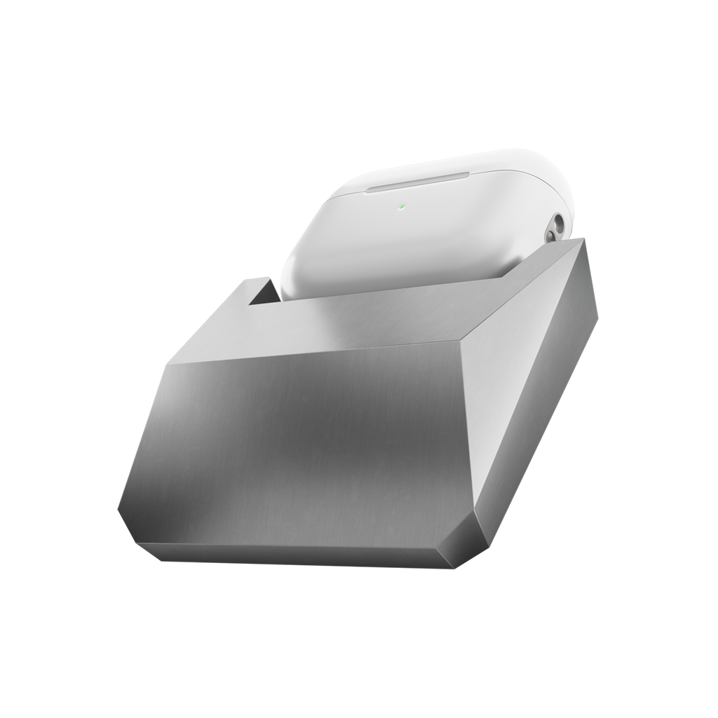 為 AirPods 以及支援 Qi 無線充電的耳機設計的車用充電底座,內建在 Tesla 車內的無線充電器中使用。設計靈感來自 Cybertruck 的銳利線條與銳角,並採用與 Cybertruck 相同耐用的不銹鋼材質。