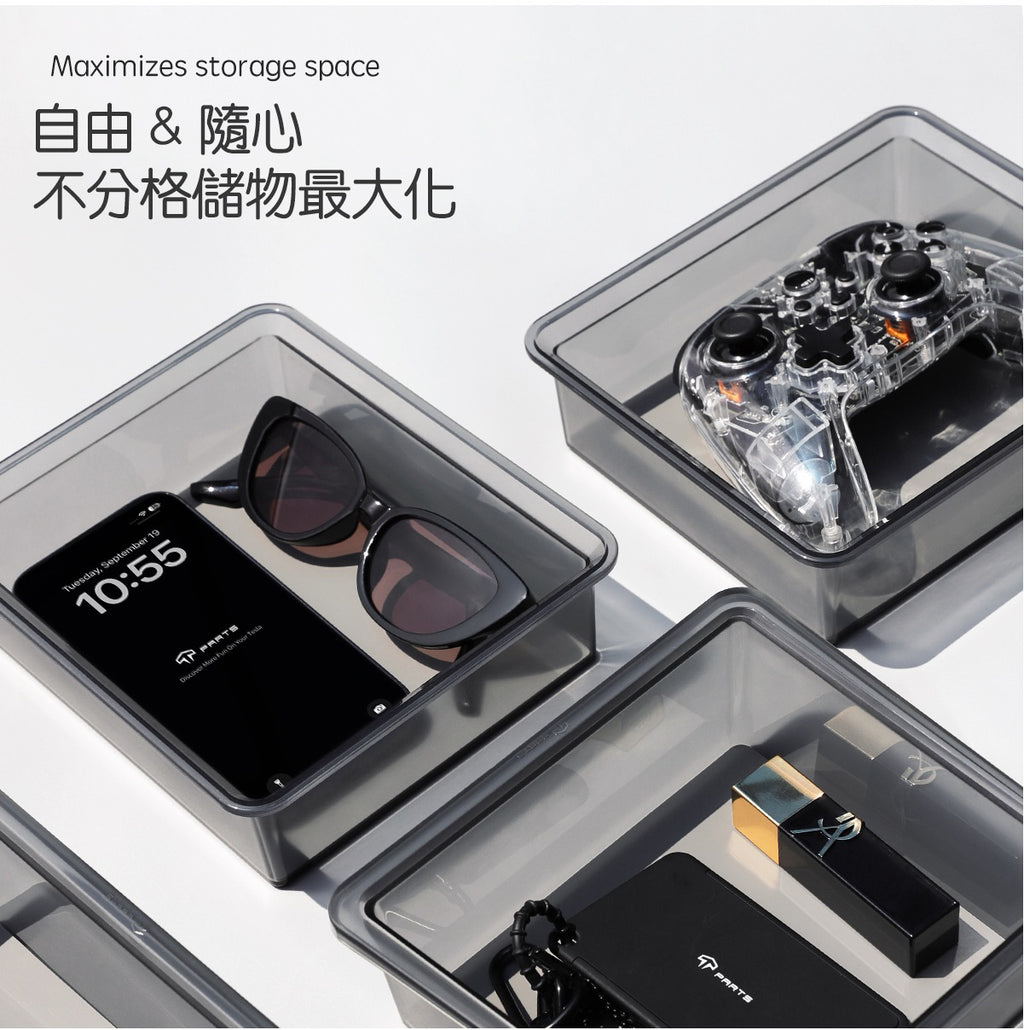 內容物包含:一個16cmx15.2cm的中控抽屜式透明儲物盒